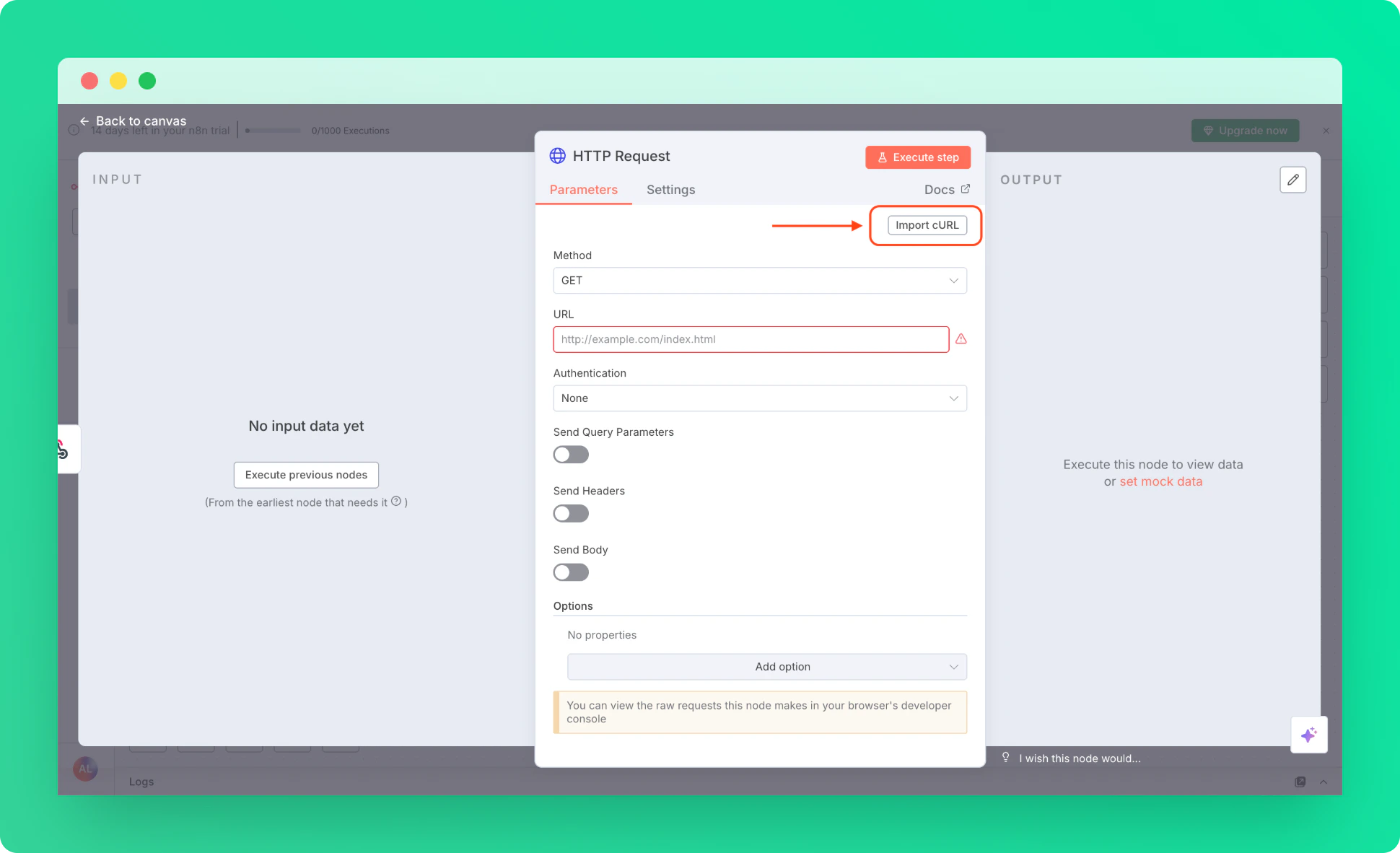 4. Back to the n8n, in HTTP Request Parameters tab, use import cURL.