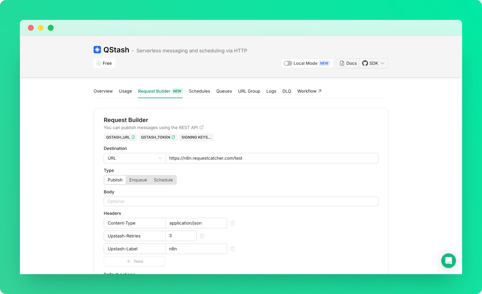 1. Go to Upstash Console and open QStash Request Builder Tab.